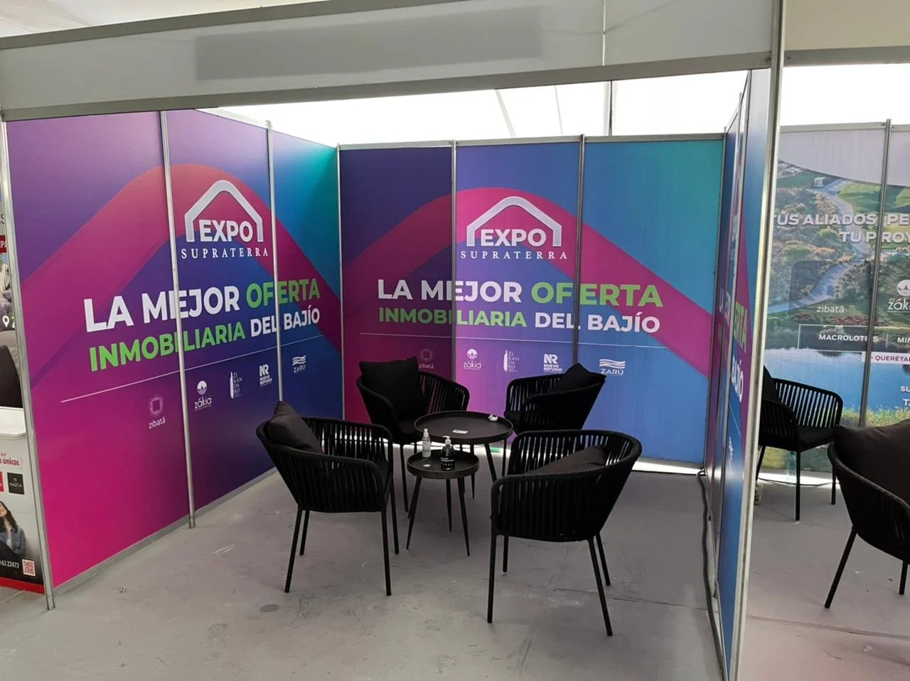 Impresión de graficos en vinil autoaderible en las paredes del stand.